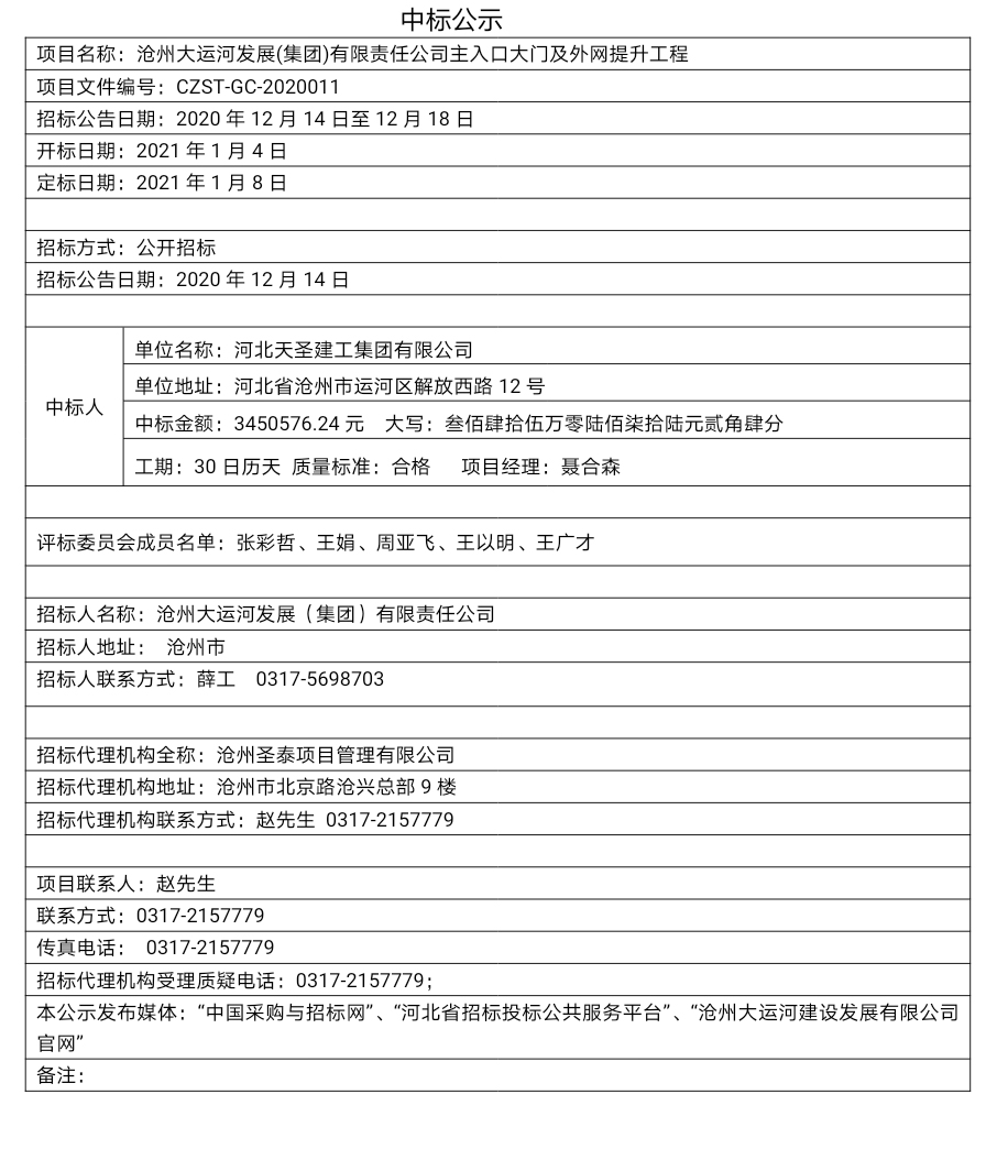 關(guān)于滄州大運(yùn)河發(fā)展(集團(tuán))有限責(zé)任公司主入口大門及外網(wǎng)提升工程的中標(biāo)公示